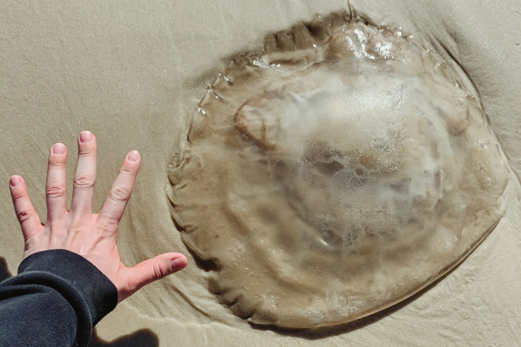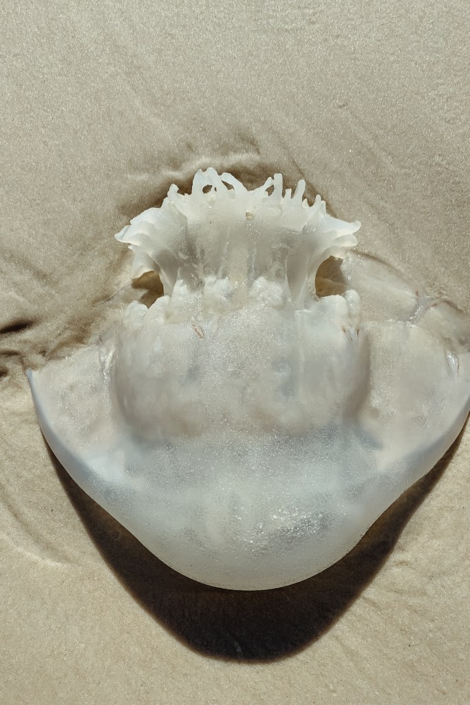 Saturday morning we went to Burgoyne Road and found the parking lot was a ¼ mile to the beach with very few parking spots. It was 45 degrees out. We bundled up and set off. The first few miles went well and we saw a bunch of wildlife- a few different jellyfish, blue heron, big group of seagulls, a little crab and huge pelicans. Around four miles in, a massive bait ball appeared. There were tons of birds and dolphins everywhere. We stopped and watched and just took in the awesome sight.