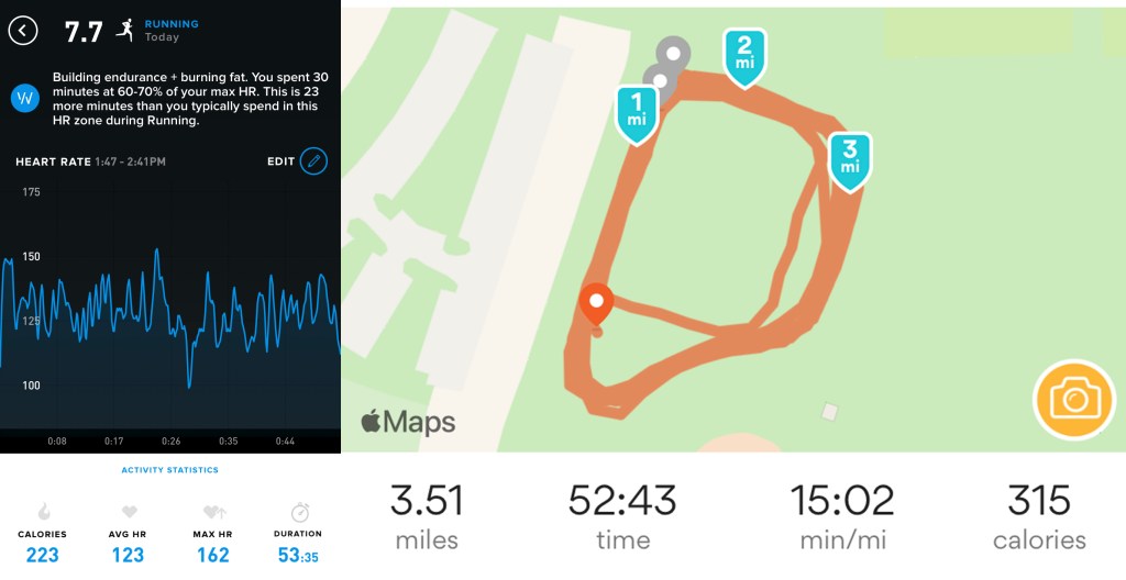 I know I am getting better at running because three miles seem like a breeze. If I have to run slower or walk to keep at a lower heart rate, then that’s what I’ll do. I have to remind myself everyday is not a race. It’s a finish- to complete not compete. I need to be patient and continue to work hard. Consistency and learning my body will be the key to success.