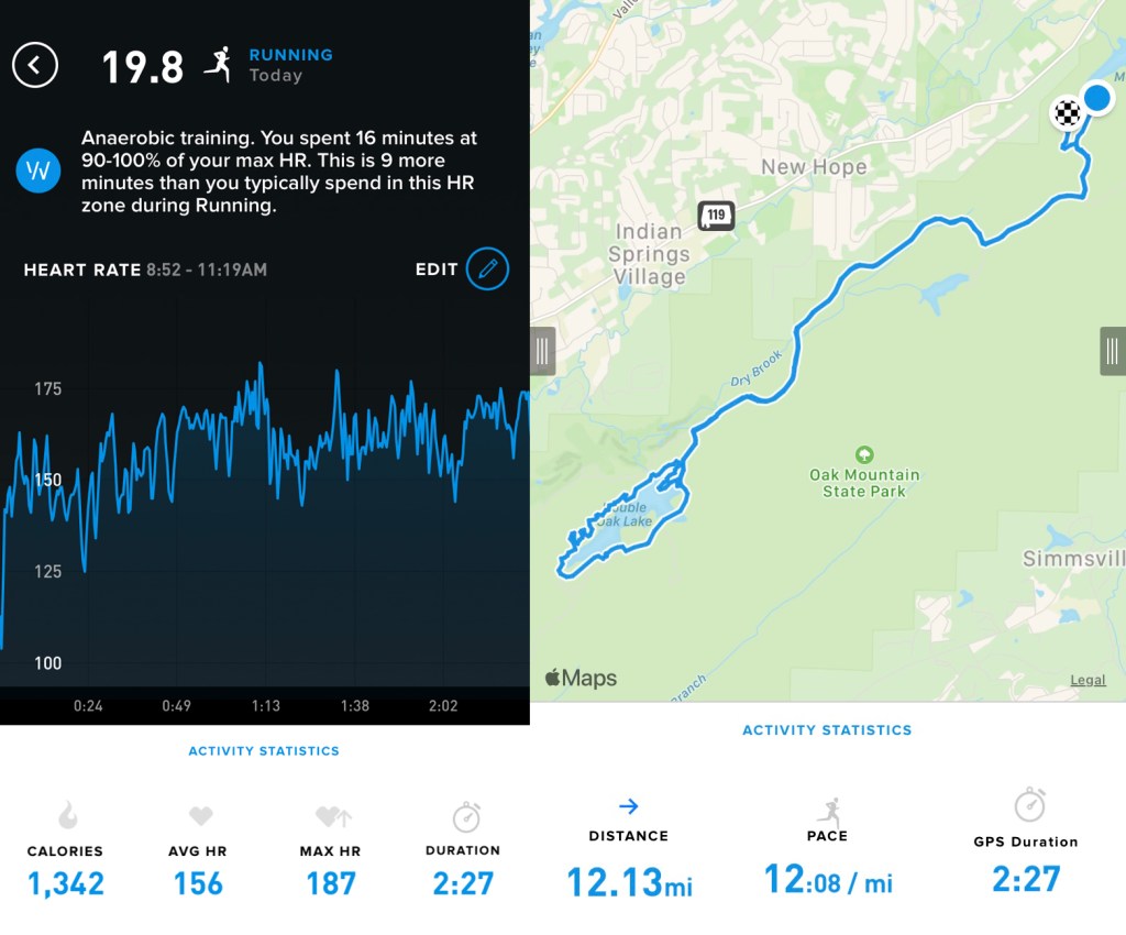 I did it. I ran 12 miles this week for my long run- up and down paved roads and on trails of Oak Mountain State Park. This was by far harder than my half marathon in and around my flat neighborhood. It was hot and majority without shade. I walked some but pushed myself to run up hills and take a walk break when I was at the top. I have realized I enjoying running with friends, but I was by myself this time. I downloaded a book to my phone and ran while it read to me. Using the same principle of keeping my brain busy, listening instead of thinking about how hard the run was. It worked. When I found myself thinking about a section of uphill, I realized I wasn’t paying attention to what was happening in the story- pulling me back out of my misery.